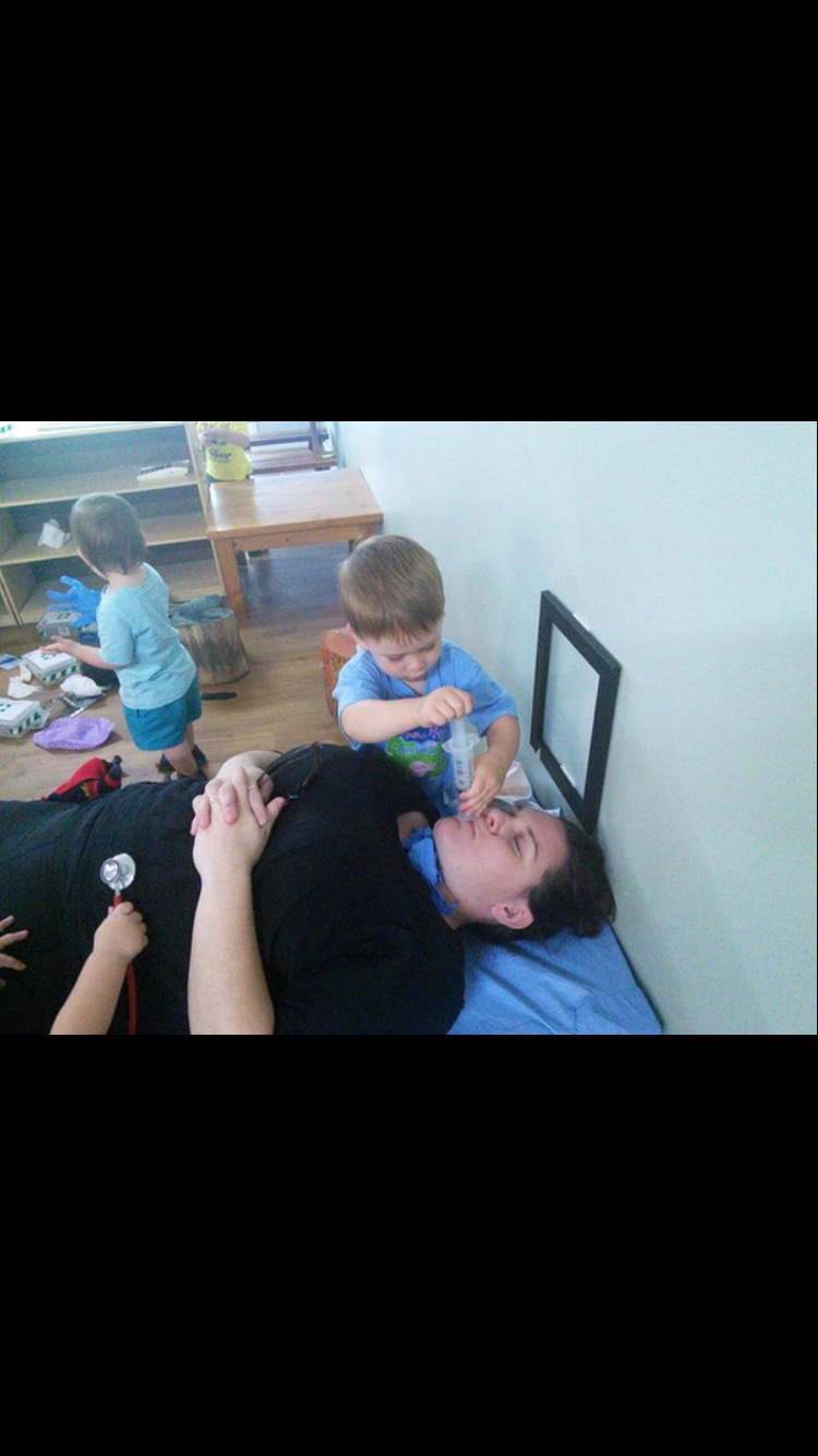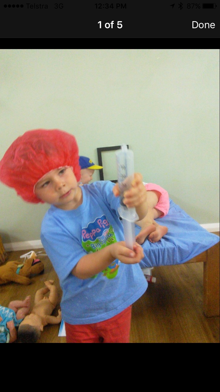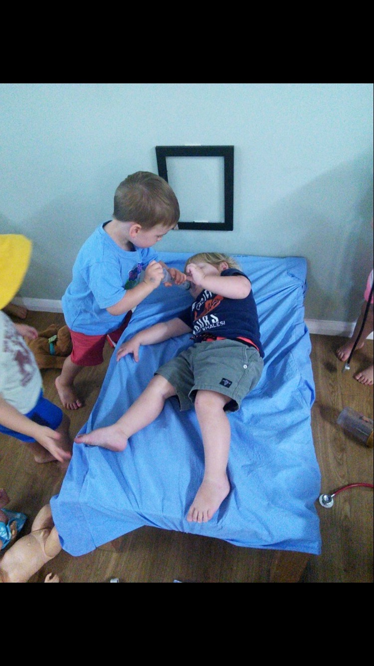 William enjoyed the hospital area today. Taking on the role of patient and doctor, William asked Aimee to hope up onto the table so that he may “make her better”. Also giving medical treatment to his peer Oliver. Once every one else was feeling better, William climbed up onto the table to receive bandages around his ‘sore ankle’.