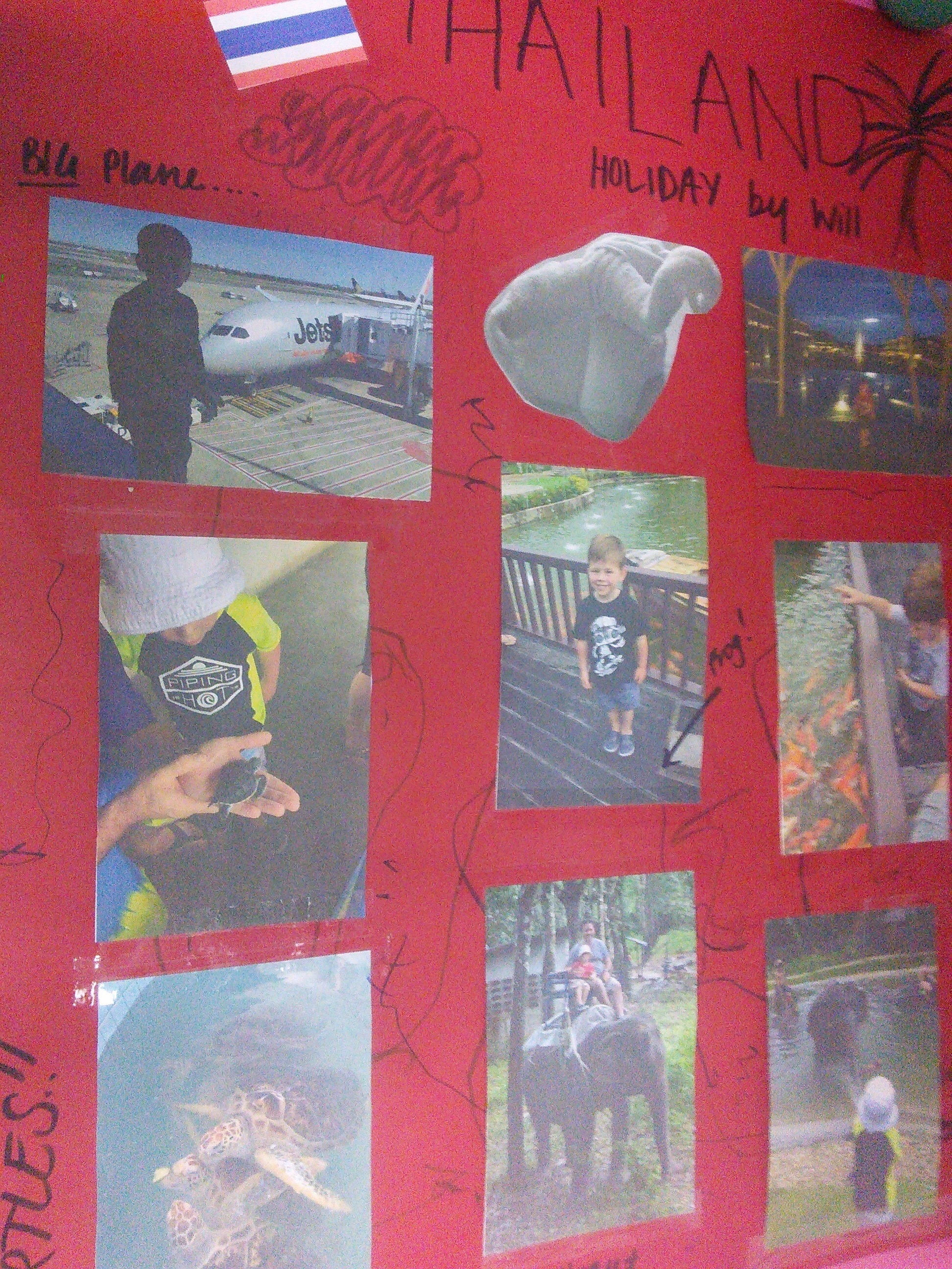 This morning William brought in a poster with photos from his trip to Thailand. The toddlers were very interested in where Thailand is in the world that Chloe used the globe to explain where Thailand is in the world. From this the children spoke to Chloe about how they live in Australia and helped Chloe find Australia on the globe. William then told his friends about the different animals he saw, including riding an elephant and holding a turtle!