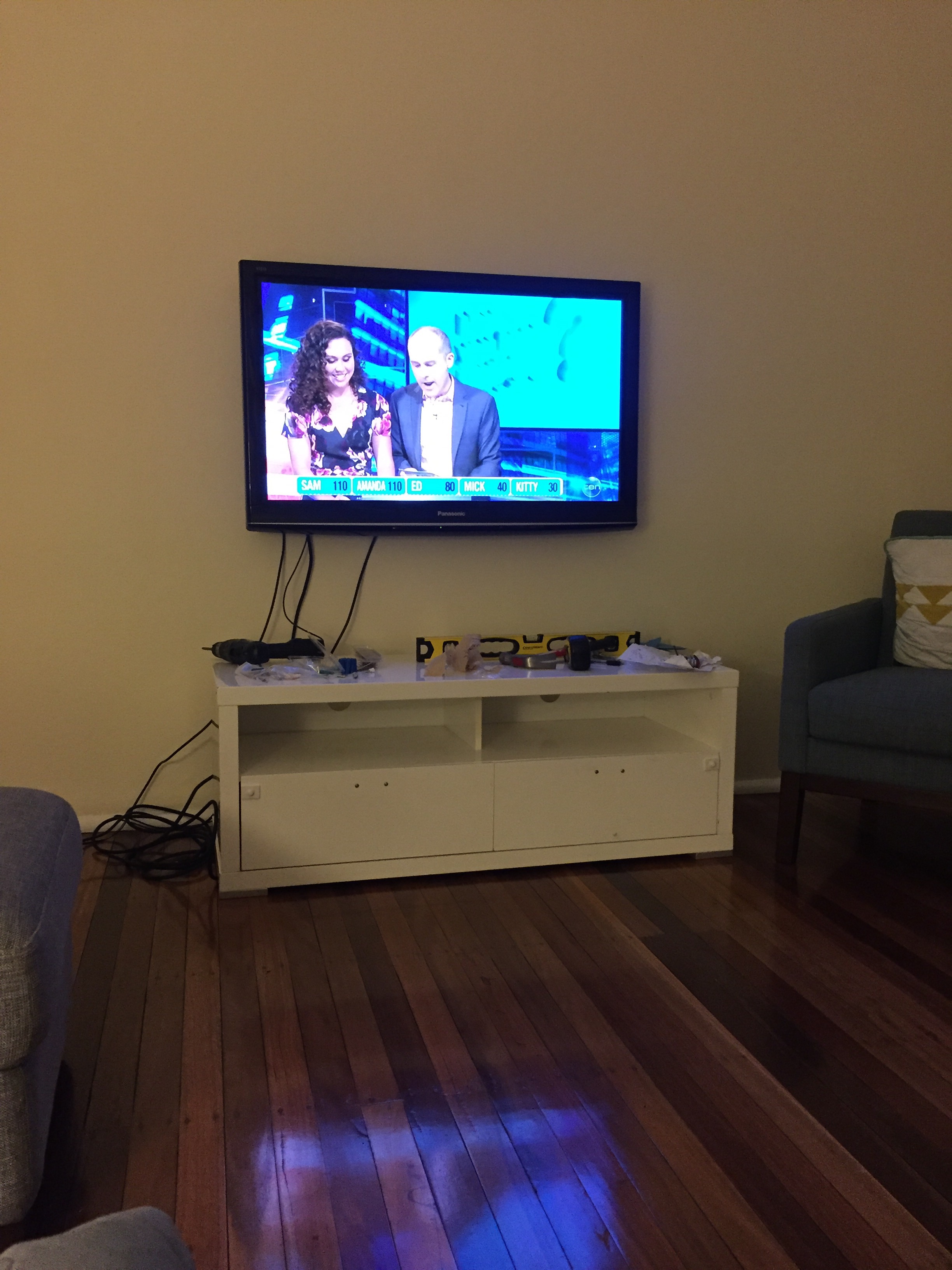 The TV was a priority to get wall mounted – a quick visit to a Bunnings  for some chunky wall plugs. Thanks Jimmy for your help! Next step getting some conduit to hide those horrible cables.