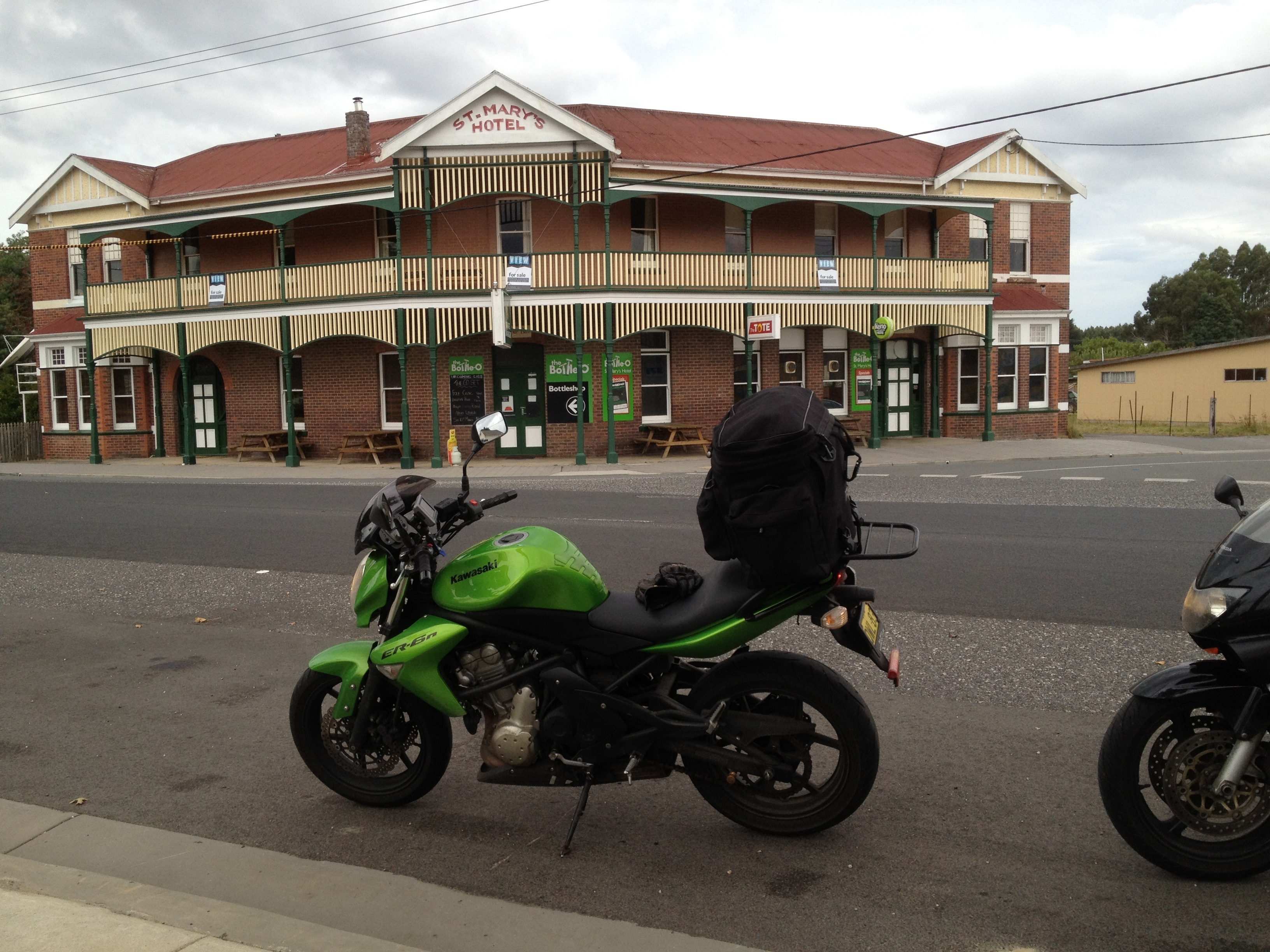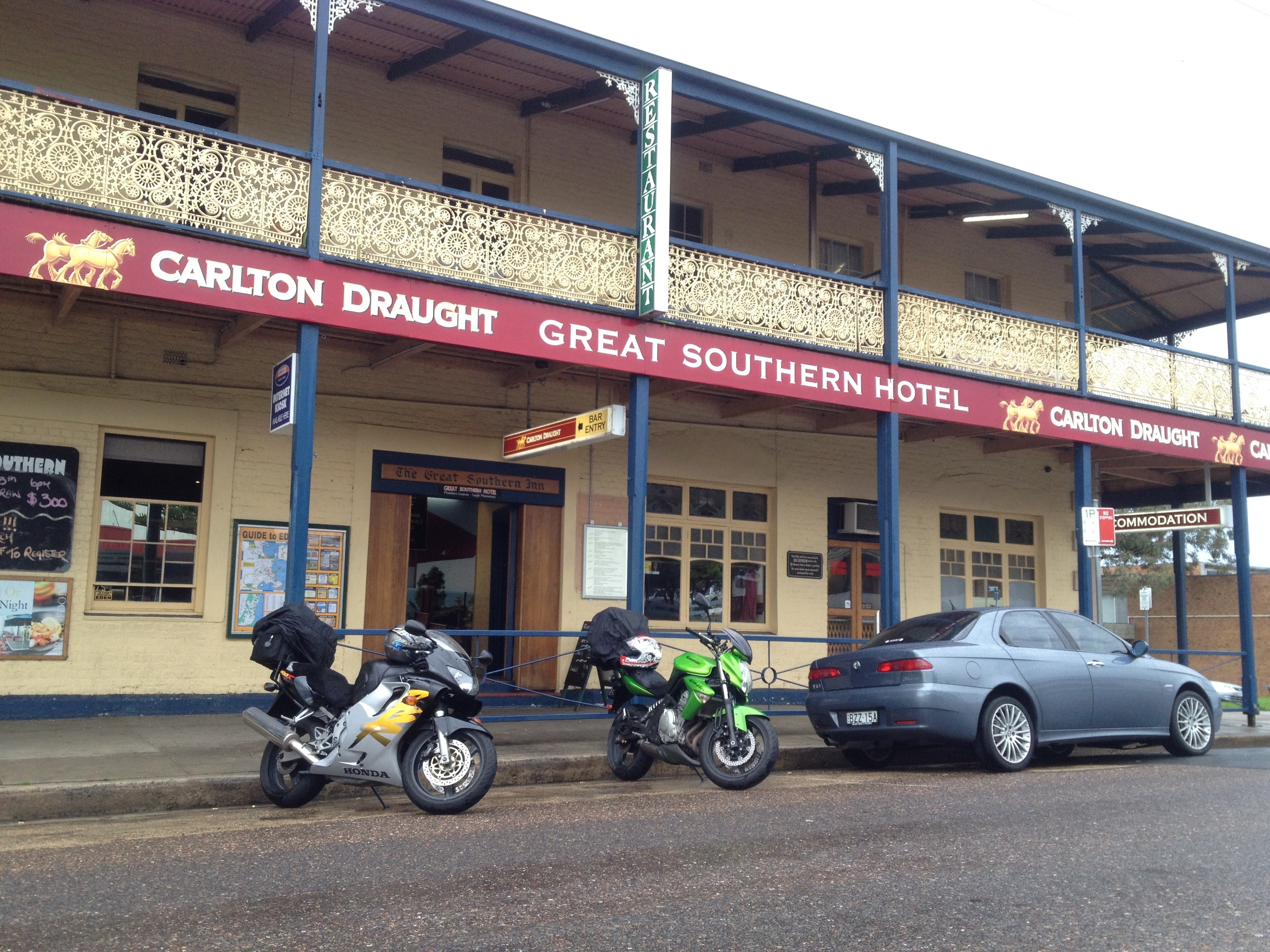 Our accommodation @ The Great Southern Inn was essentially very basic – a tiny room which consisted of a bunk bed, shower and toilet. The somewhat unusual stench in the room wasn’t noticeable after a few minutes! Limited drying space for our wet gear will more than likely result in a damp start tomorrow! The local hospitality we’ve already experienced has been good with the offer to lock our bikes up in the bottle shop over night. Thanks Darryl!