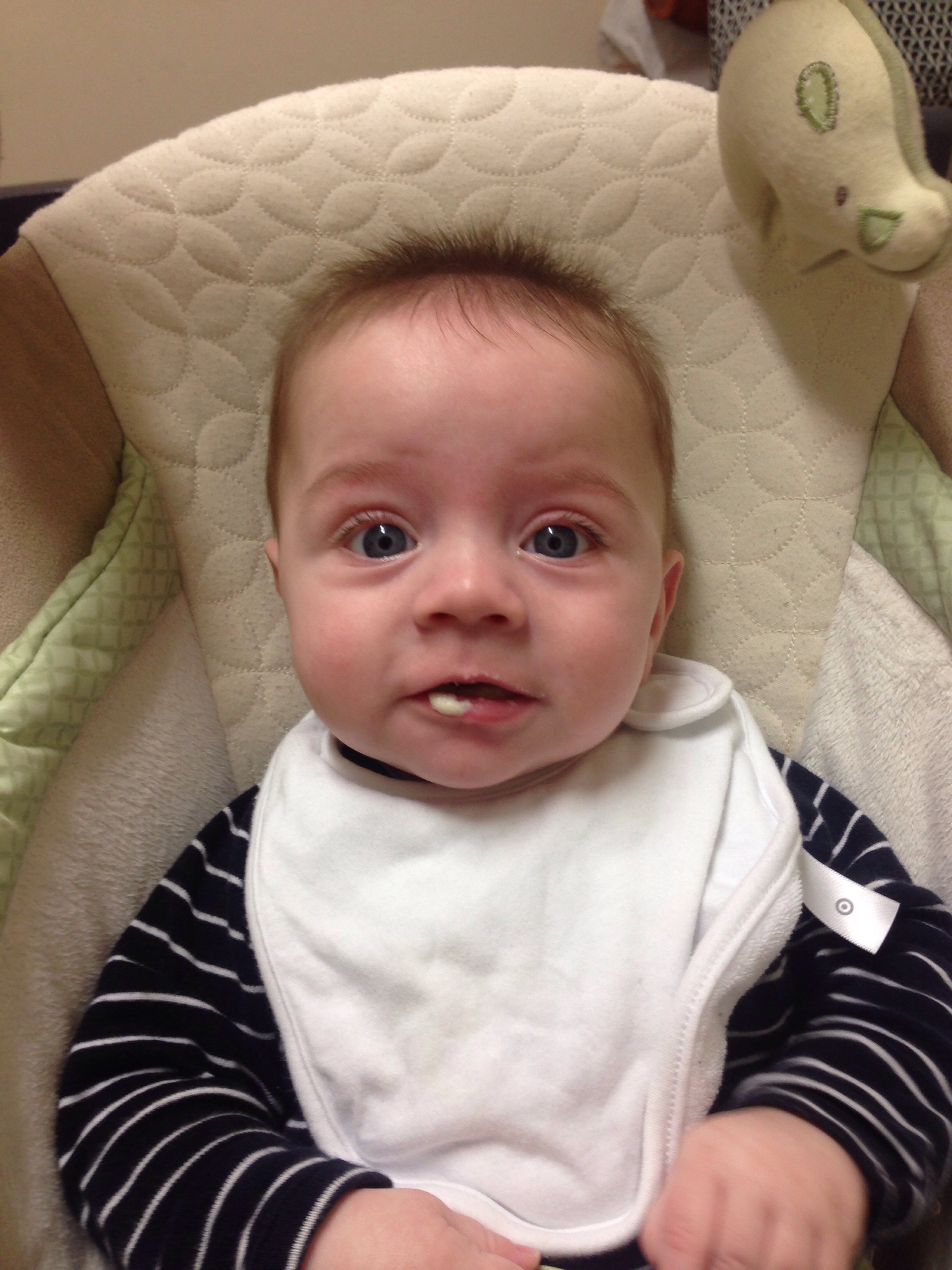 Jack is a few days off 7 months and learning everyday! He is making all sorts of noises and even saying “dad dad dad dadda” He is now starting to eat more and understands what to do with food so I am giving him 3 small meals a day with some luck!